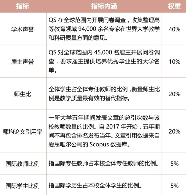 自2004年起,QS组织每年公布一次世界大学排名。排名从“学术声誉”、“雇主声誉”、“师生比”、“师均论文引用率”、“国际教师比例”和“国际学生比例”六个维度对大学进行排名,其中学术同行评价指标一直占有较大比重(40%)。