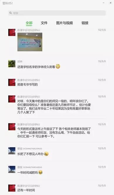 聚会的活动其实很早就在筹备了。在学校发布秩年返校活动计划以前很久,我们班就计划着今年的聚会。我查了一下,那是在2018年9月8日,我在参加04管科的座谈会时抽空在“管科05!”班级群中发了一张照片,引发大家对于2019年聚会活动的无限憧憬和热烈讨论。